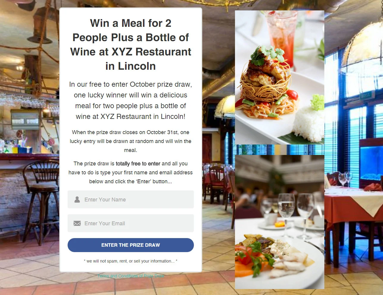With my Viral prize Draw Software we'll offer a prize of your choosing (something such as a free meal for two would work great for a restaurant, for example) and I'll then create an attractive looking entry page for the draw.